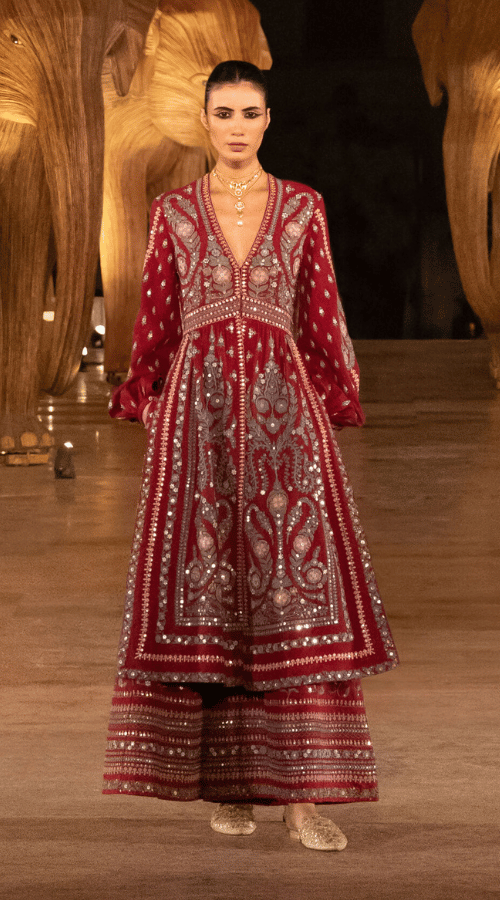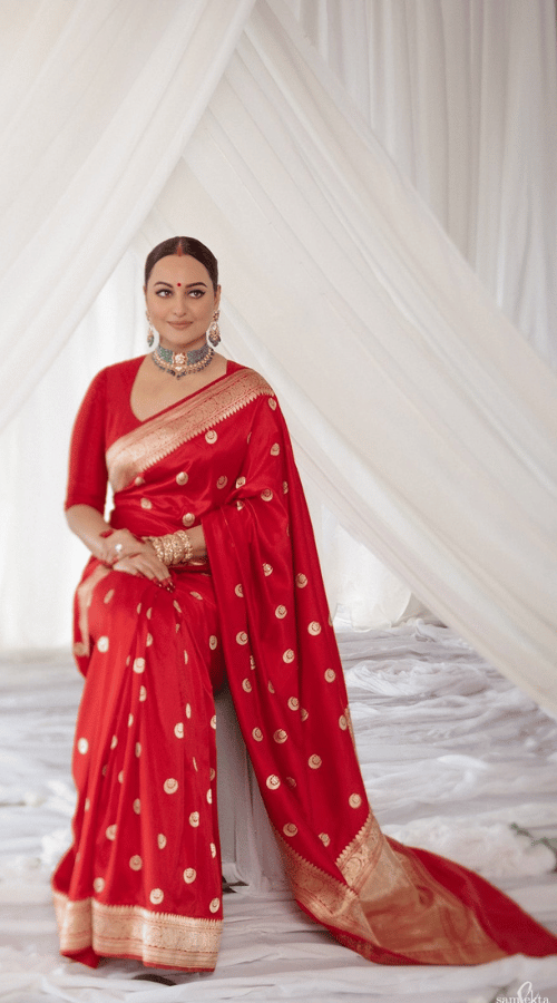 However, it was at the wedding reception where Sonakshi truly dazzled. Initially, she was seen in a stunning bright red Varanasi silk brocade saree by Sanjay Garg’s label Raw Mango. This ‘Chand Buta’ handwoven saree, adorned with crescent moons, was paired with a solid red blouse priced at INR 79,800. Her look was completed with a custom-made choker set from Karan Johar’s Tyaani Fine Jewellery and a tall stack of red bangles, perfectly capturing traditional elegance with a modern twist.