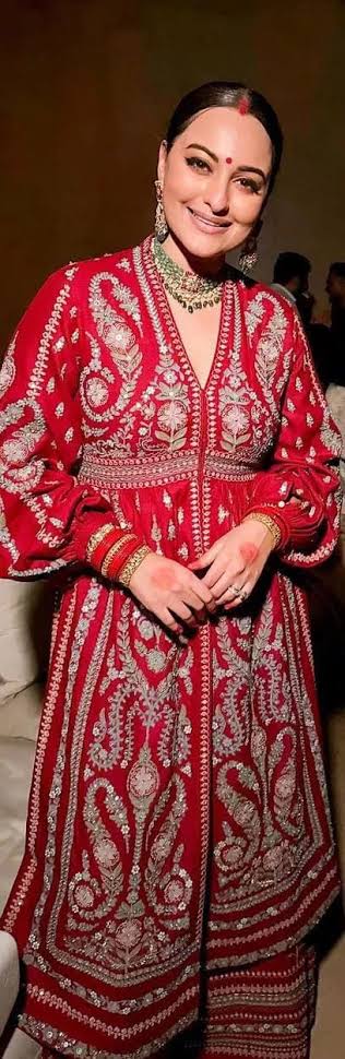 Later in the evening, Sonakshi changed into an exquisite heavy kurta set designed by the renowned Anita Dongre. This modern full-sleeved ensemble featured intricate cord and zardozi embroidery, adorned with sequins that added a touch of sparkle to her look. The Anita Dongre kurta set, priced at Rs 2,55,000, is available for purchase if you wish to replicate Sonakshi’s sophisticated and elegant style. This stunning piece can be styled to suit your personal taste and make a statement at any event. Sonakshi kept her makeup consistent with her earlier appearance, opting for subtle eyeshadow, a dazzling highlighter, perfectly groomed brows, glossy lips, sharp contouring, sleek eyeliner, and heavy mascara on her lashes. Her hair was styled in a gajra-adorned bun, and she accessorised with an exquisite neckpiece, matching earrings, and traditional red chooda, completing her bridal look with grace.