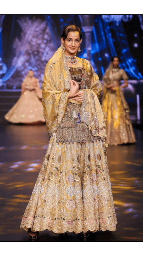 The highlight of the evening was the appearance of Sonam Bajwa as the showstopper for White Lily’s ‘RANISA’. Sonam, known for her grace and beauty, perfectly embodied the essence of the collection. She graced the runway in an exquisite peach-colored lehenga that shimmered with gold embellishments, creating a mesmerizing spectacle that evoked the essence of Punjabi royalty. The intricate Zardozi work and the scalloped borders added a touch of delicate sophistication, making it a standout piece in an already breathtaking collection. Sonam’s presence added a contemporary flair to the collection, highlighting the seamless blend of traditional and modern elements. Her confidence and poise brought the garments to life, showcasing their beauty and craftsmanship in a way that resonated with the audience.